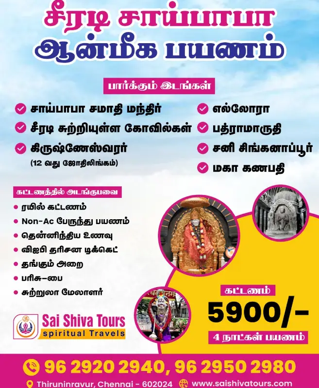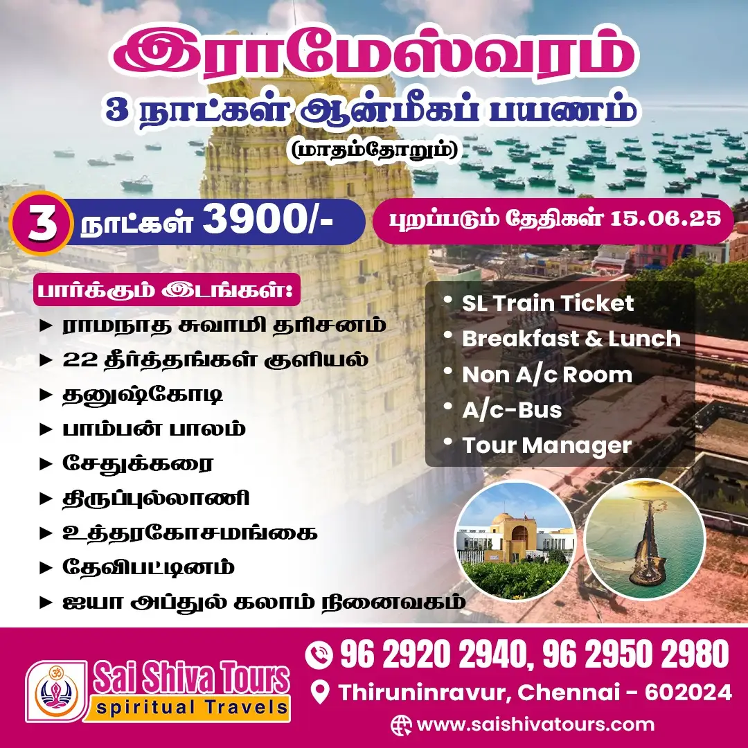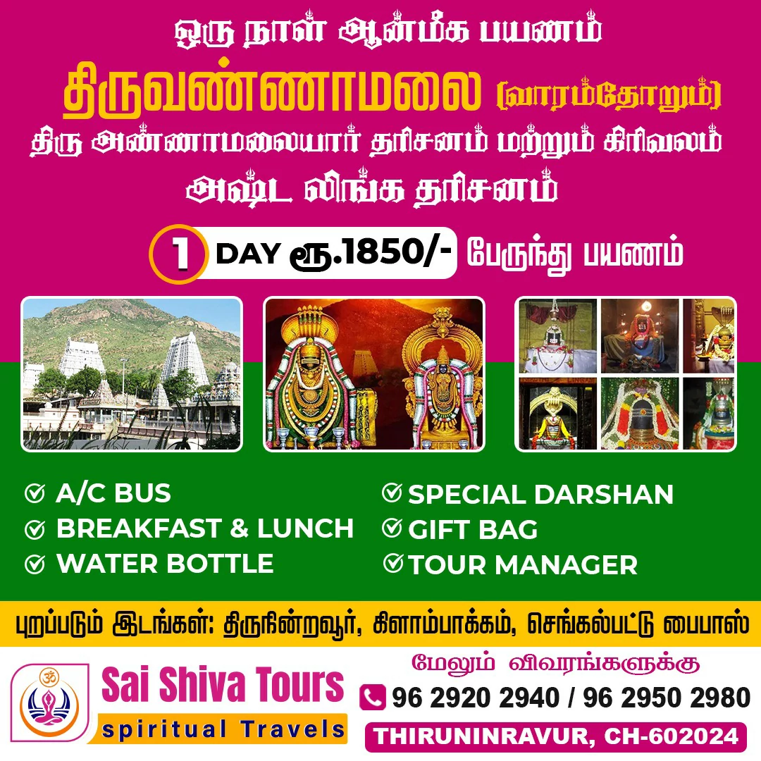 Sai Shiva Tours offers you to explore South India's spiritual richness. Visit prominent places such as Rameswaram, known for the Ramanathaswamy Temple and its sacred waters, and Tirunelveli, home to the historic Nellaiappar Temple. Experience the mystical ambience of Thiruvannamalai, where the Arunachaleswarar Temple and the Girivalam walk attract thousands of pilgrims.